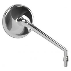 Edler Universal-Spiegel mit einem runden Kopf aus hochwertigem Aluminium, schwarz eloxiert. Der stilisierte Propeller auf der Rückseite des Spiegelkopfes unterstreicht das außergewöhnliche Design dieses Modells. Das leicht getönte und gewölbte Spiegelglas bietet einen optimalen Blendschutz. Inklusive extra Adapter M10x1.25mm mit Linksgewinde für Yamaha.