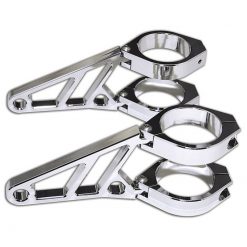 Das Lampenhalter-Set aus Aluminium enthält 4 Schellen sowie je 2 Halter und Reduzierstreifen. Die Halter sind so an den Schellen befestigt, dass sie auf die Scheinwerferbreite eingestellt werden können. Sie besitzen eine Aufnahme zur Blinkerbefestigung bis zu einem M10-Gewindebolzen.