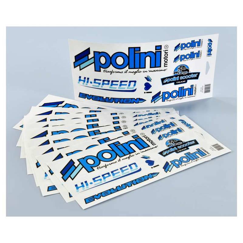 Diverse, einzeln abziehbare Polini Sticker auf einem Bogen.