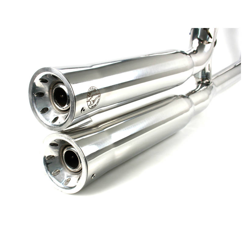 Kerniger dumpfer Chopper-Sound und maximale Leistung. Hergestellt aus V4 Edelstahl, wahlweise in hochglanz-polierter bzw. matt-schwarzer Ausführung. Krümmer in Doublewall Technology. Doppelwandiger Krümmer mit 60mm Durchmesser. Endtöpfe im Groove Style. Wahlweise als 2-2 Komplettanlage bzw. Ersatzdämpfer, passend auf Serienkrümmer und mit bzw. ohne Katalysator lieferbar.
