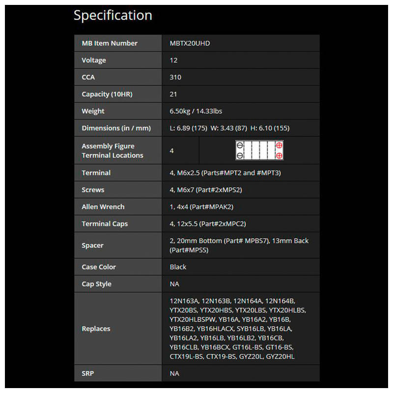 4-polig, (mit 20mm Bodenabstandshalter und 10mm Seitenabstandshalter), Kaltstartstrom 310 Ampére bei Minus 18 Grad. Ersetzt oder enspricht dem Japancode oder DIN: 12N163A, 12N163B, 12N164A, 12N164B, YTX20BS, YTX20HBS, YTX20LBS, YTX20HLBS, YTX20HLBSPW, YB16A, YB16A2, YB16B, YB16B2, YB16HLACX, SYB16LB, YB16LA, YB16LA2, YB16LB, YB16LB2, YB16CB, YB16CLB, YB16BCX, GT16L-BS, GT16-BS, CTX19L-BS, CTX19-BS, GYZ20L, GYZ20HL