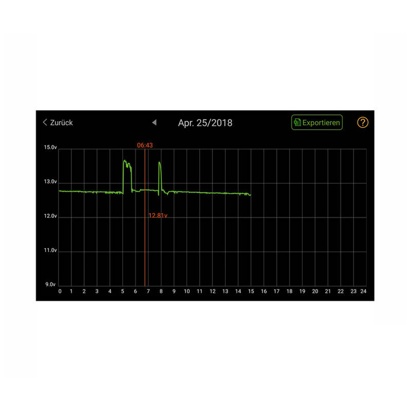 Durch die kontinuierliche Aufzeichnung wird der Ladezustand der Batterie während Fahrten erfasst und lässt sich auch später noch aufrufen. Die Datei mit den Daten lässt sich per Email vom Smartphone versenden und in Excel anzeigen. So kann man schnell erkennen wo die Ladespannung eingebrochen ist oder zu hoch war. Darüber ist ein defekter Regler schnell zu erkennen.