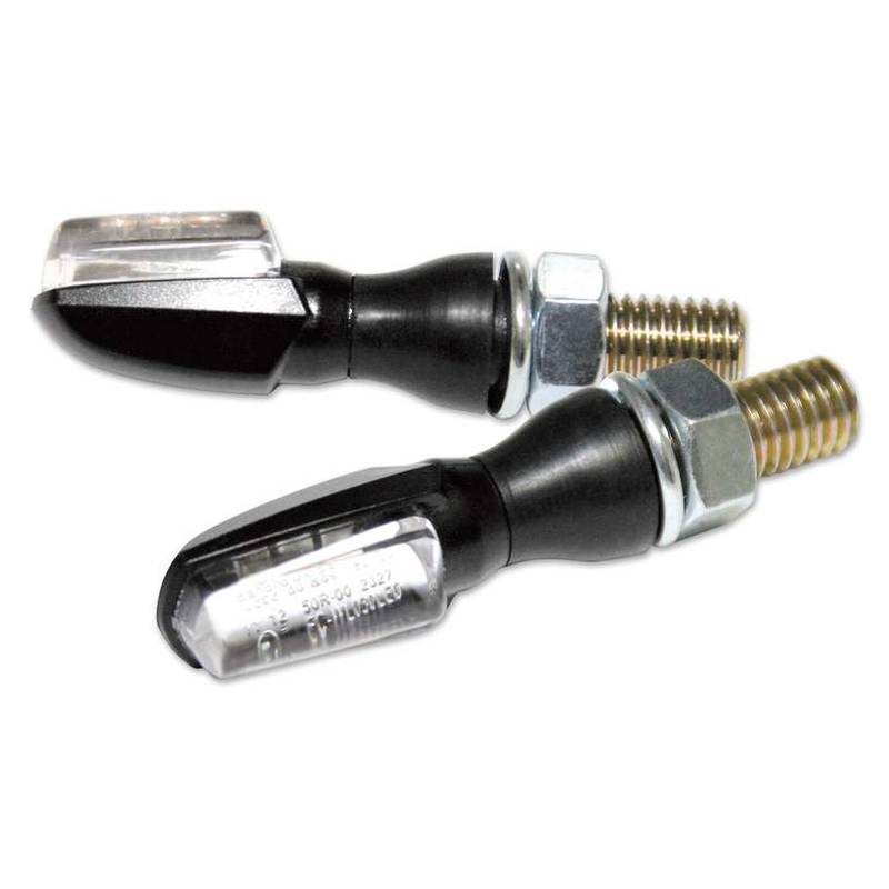 Modernste Lichttechnik in extrem kleinen Maß verpackt. Ein optisches Highlight an jedem Motorrad. Mini-Blinker mit schwarzem Kunststoffgehäuse und transparentem Glas, E-geprüft.