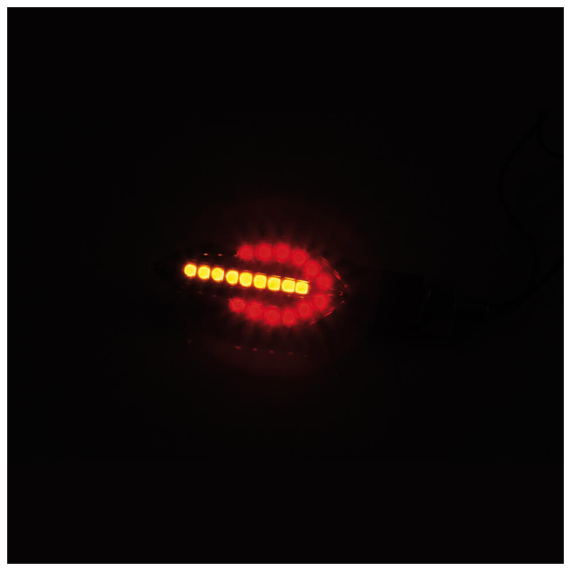 Voll im Trend: Lauflicht-Blinker erfreuen sich immer größerer Beliebtheit. Blinker, Rück- und Bremslicht in einem Leuchtelement vereint. An/Aus war gestern, bei diesem coolen Sequenz-Effekt leuchten die LEDs nacheinander von innen nach außen auf, so entsteht ein optischer Wischeffekt. Freuen Sie sich auf diesen eleganten Fahrtrichtungsanzeiger mit dunklem Blinkerglas, dessen Form und Funktion wunderbar miteinander verschmelzen. Ein absoluter Hingucker am Motorrad! Der FORK kann als Blinker am Heck eingesetzt werden und ist E-geprüft für hinten.