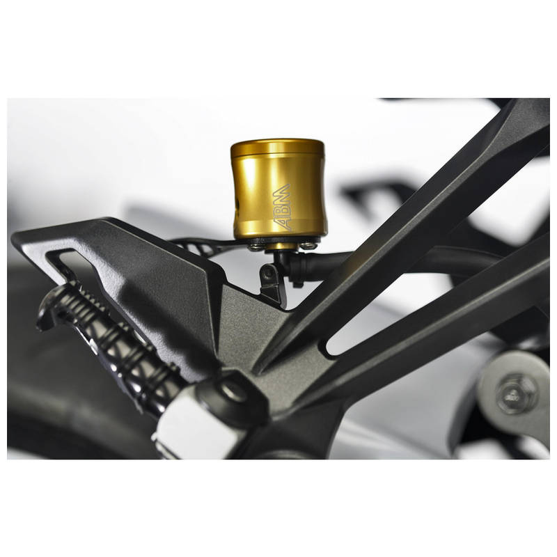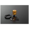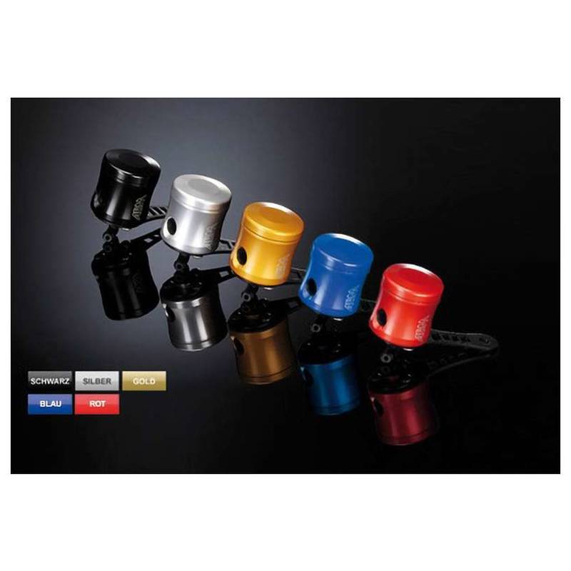 Aluminium Ausgleichsbehälter, CNC gefräst, glanzeloxiert, Fassungsvermögen 26 ml, Bremsflüssigkeitsschlauch im Lieferumfang enthalten. Individuell anpassbarer Halter zur Befestigung am Fahrzeug, 360° ausrichtbarer 90° Anschluss, Sichtfenster aus Echtglas. Auch als Behälter für den Fußbremszylinder verwendbar, Gewicht 64 g