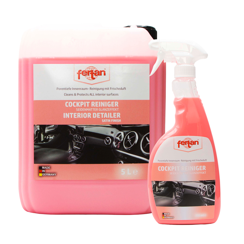 Zur Reinigung und Pflege sämtlicher Oberflächen im Autoinnenraum mit seidenmattem Glanzeffekt. Leichte Verschmutzungen werden einfach und schonend entfernt. Der Fertan Interior Detailer verhindert elektrostatische Aufladungen, wirkt staubabweisend und schützt vor Wiederverschmutzung. Der Cockpit Cleaner hinterlässt einen angenehmen, frischen Duft.