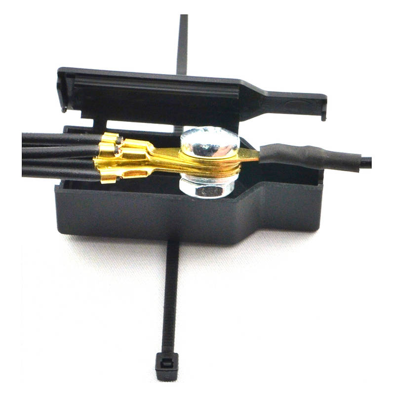 Ermöglicht den Anschluss von maximal 5 Kabelschuhen an einem Batteriepol. Mit der Sammelschraube werden die Kabelschuhe von verschiedenen Verbrauchern wie Bordsteckdose, Griffheizung, Elektronikprotektor, Nachru¨stwarnblinkanlage, Blinkerinnerung, Kettenöler usw. zusammengefasst und jeweils mit einer Leitung (rot / schwarz) zur Batterie gefu¨hrt. Die Anschlussleitung ist einseitig mit einem 8 mm Kabelschuh ausgestattet um an Auto- oder Motorradbatterien anzuschließen. Isoliert wird mit 2 Kunststoffgehäusen, die zur Sicherung zusätzlich mit einem Kabelbinder gesichert werden können. Fu¨r das rote Kabel zum Pluspol ist eine flexibel zu montierende Sicherung mit Halter im Lieferumfang.