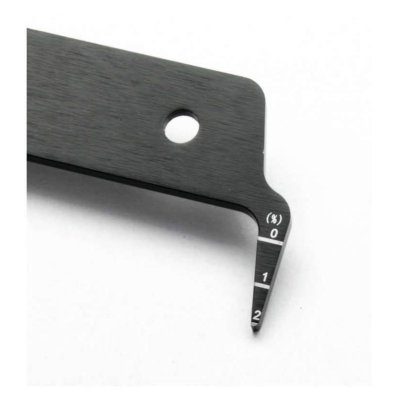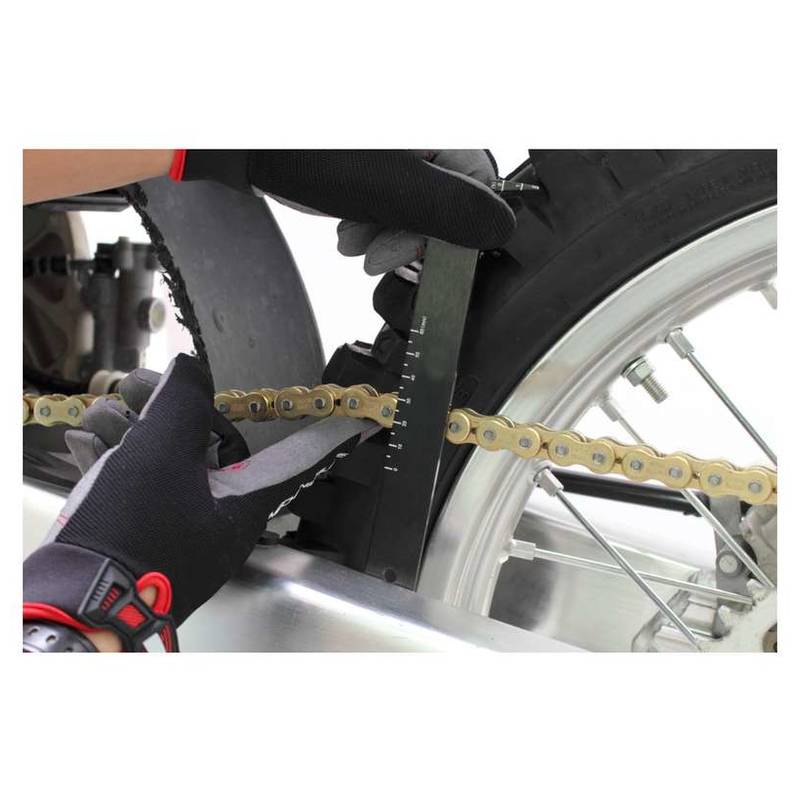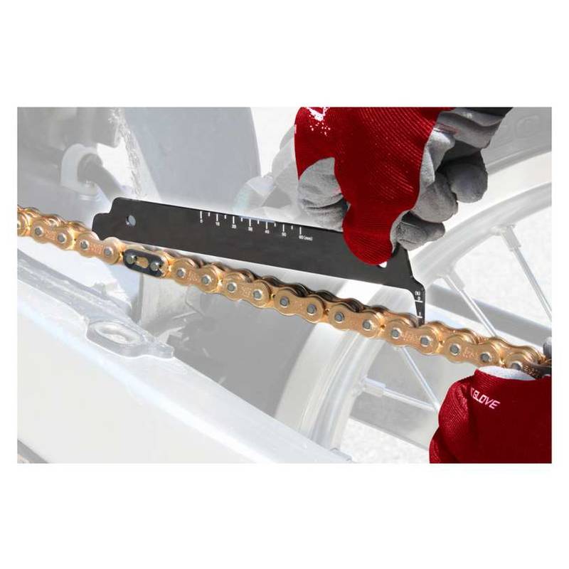 Die Kettenlängung wird auf der Messspitze dort angezeigt, wo sie die Kettenrolle berührt. Eine Kettenlängung von bereits 1% ist kritisch zu betrachten, die Kette sollte möglichst bald ausgetauscht werden. Die Kettenlängung kann auf der Kette variieren. Bitte messen Sie mehrere Bereiche auf Ihrer Kette, dies ergibt eine genauere Längungsrate. Verwenden Sie die Mittellehre für die Einstellung der Kettenflucht.