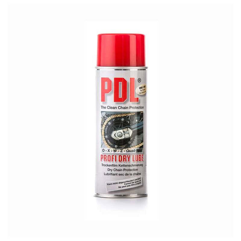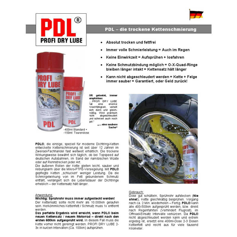 PDL® Profi Dry Lube – ist speziell für Dichtringketten (O-, X-, Z Ringe) entwickelt. Nachspannen und Reinigen der Kette entfällt. Felge, Schwinge und Motorrad-Heck bleiben für immer sauber!