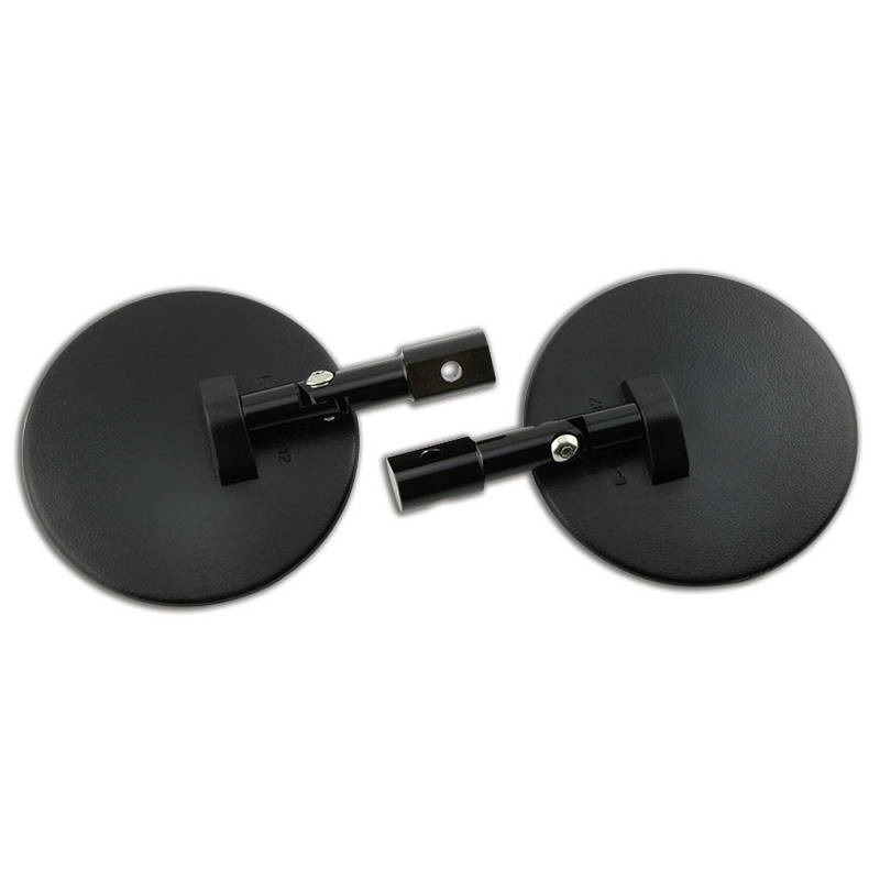 Schwarzer, runder Spiegel mit konvexem Glas, geradem, kurzem Arm und verstellbarem Gelenk.