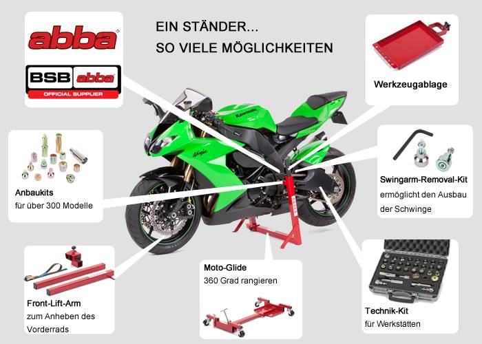 Der abba Superbike-Stand, mit dem passenden Anbausatz, passt für gut über 300 verschiedene Motorradmodelle. (Adaptersatz muss separat bestellt werden) Zahlreiche „Add-Ons“ bieten die Möglichkeit um; das vordere Ende anheben, beide Räder gleichzeitig anzuheben, die Schwinge zu entfernen und sogar das Motorrad auf engstem Raum zu bewegen.