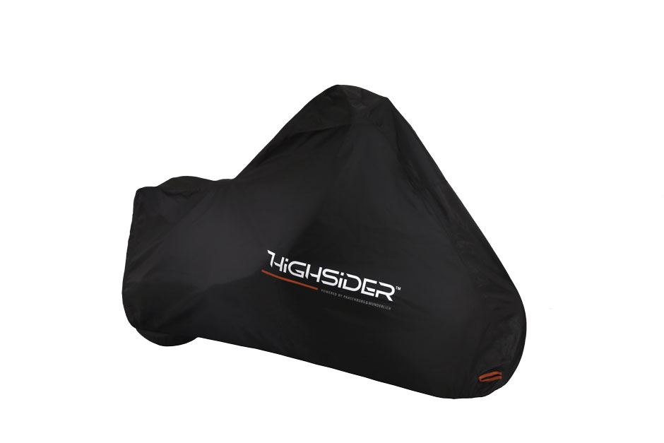 - einstellbarer Bauchgurt (unter Motorrad durch), um die Abdeckung in Position zu halten